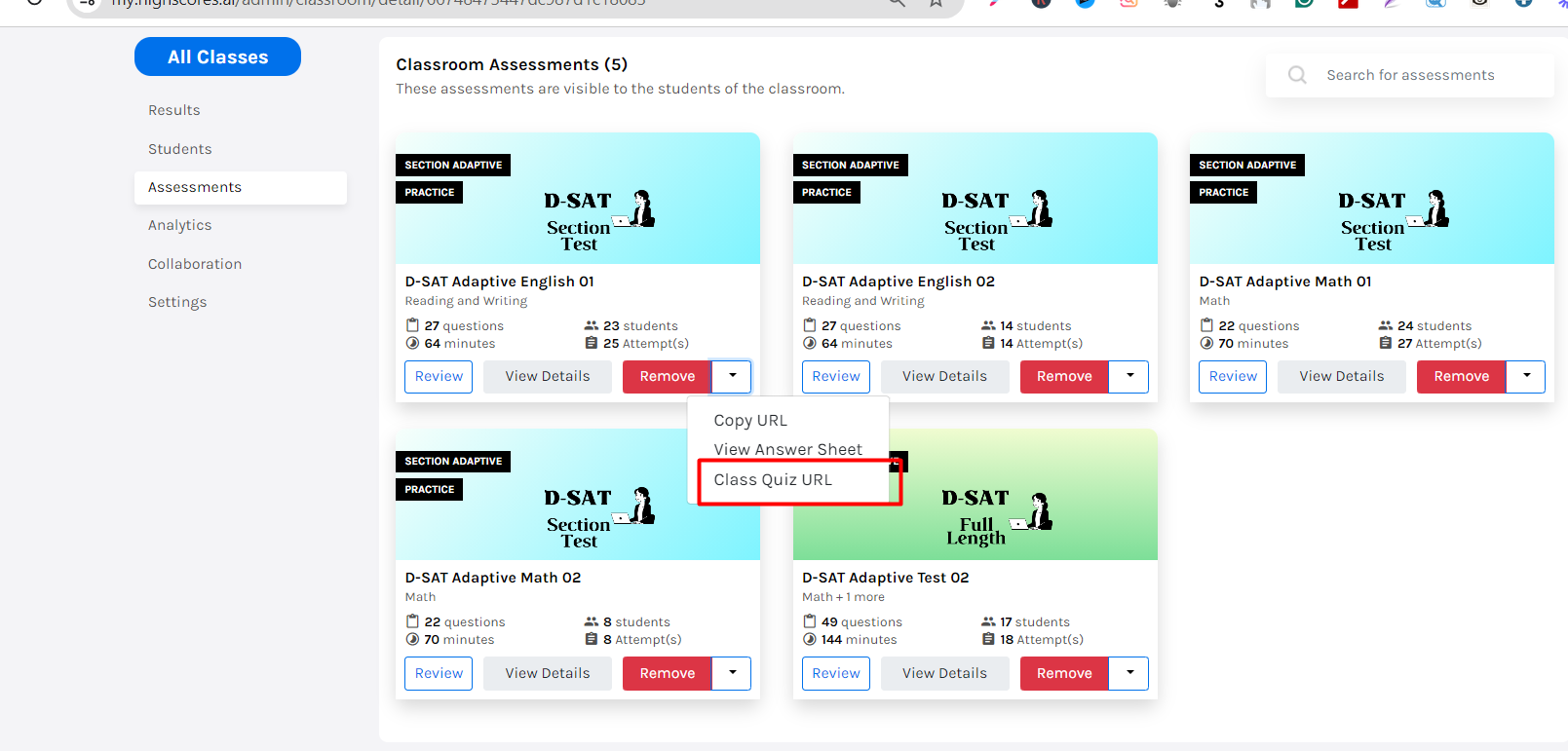 If the class quiz feature is enabled from institute preferences, a URL option is now available in the classroom. This URL can be shared with students, allowing their quiz attempts to be visible on the assessment leaderboard. It’s a great way to encourage healthy competition and track student performance.