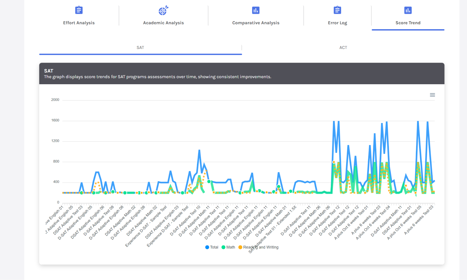 Before, the score trend graph showed how students score based on subject-wise data. Now, the score trend graph has been updated to show performance based on the selected program. This means you can see how a student is doing over time within a specific learning program, rather than just by subject.