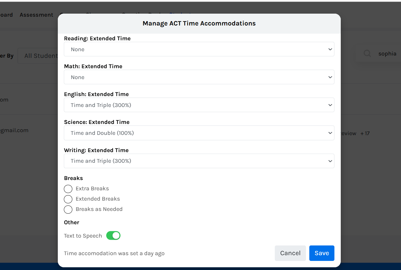 1. Allow selected students to set their own time accommodations – Reduces admin work by letting students adjust their own settings.